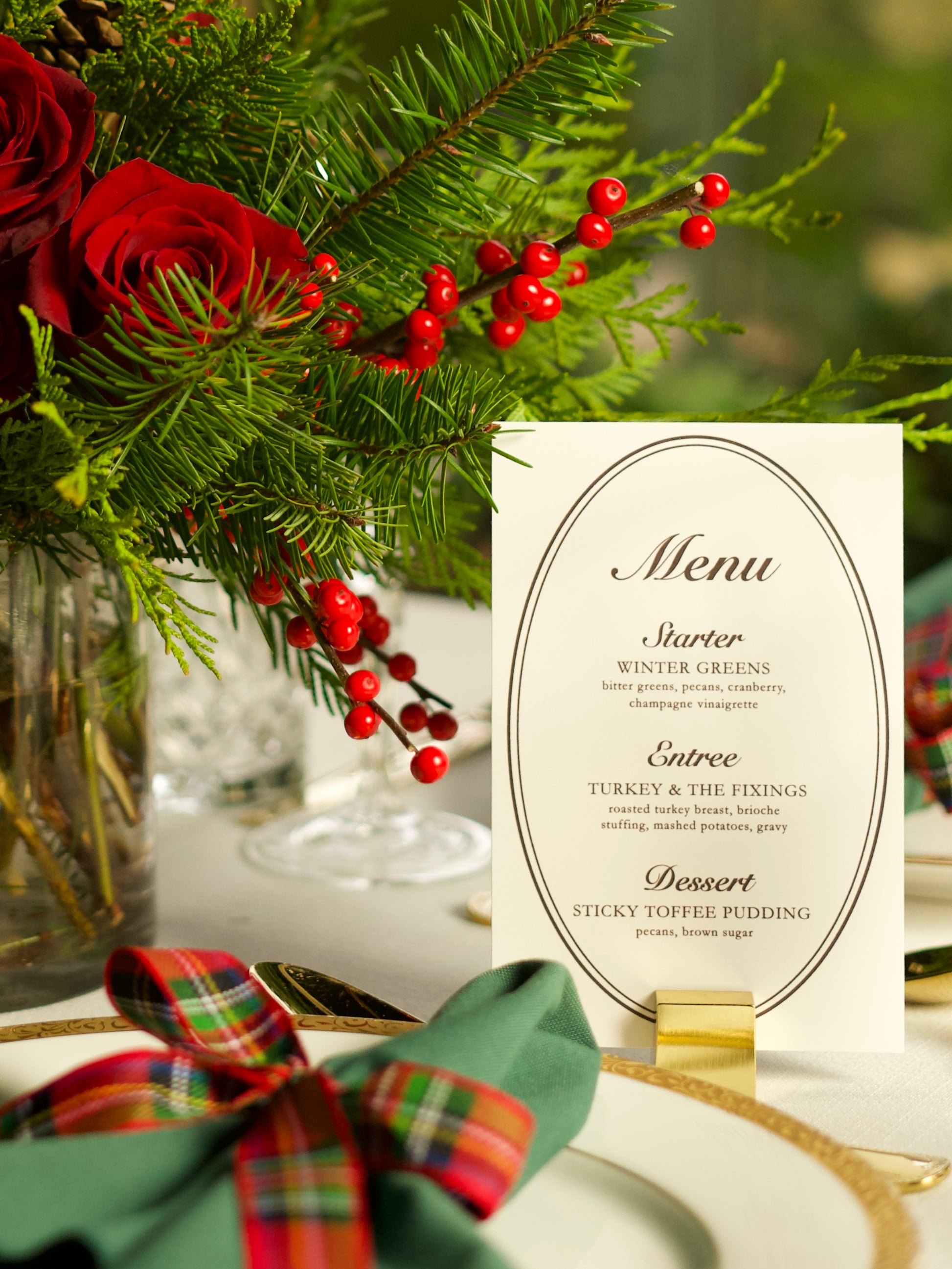 Printed menus designed to match your tablescape — $3 each with no minimum. Add them to each place setting or display them on the table for a refined finishing touch.