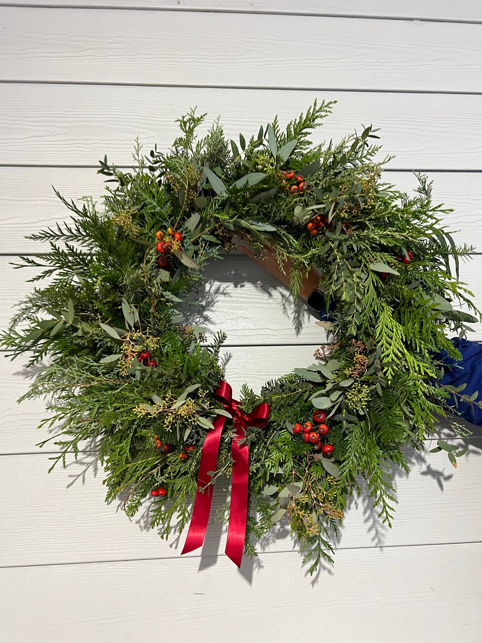 A full, lush holiday wreath handcrafted with seasonal winter greens + textural accents. Each piece is created in our Designer’s Choice style natural, full + intentionally composed with a soft, festive silhouette.